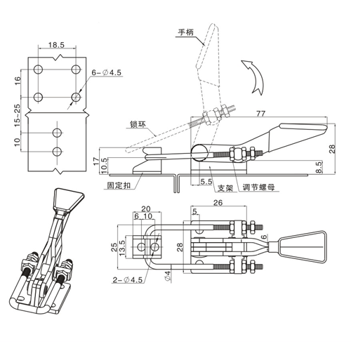 材質及表面處理:鍍鋅鋼,不銹鋼扣體,把手帶塑料套;